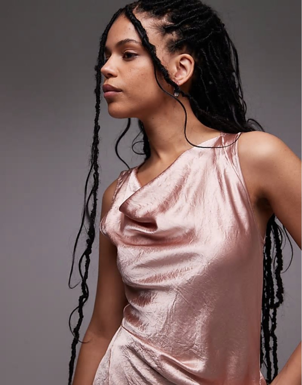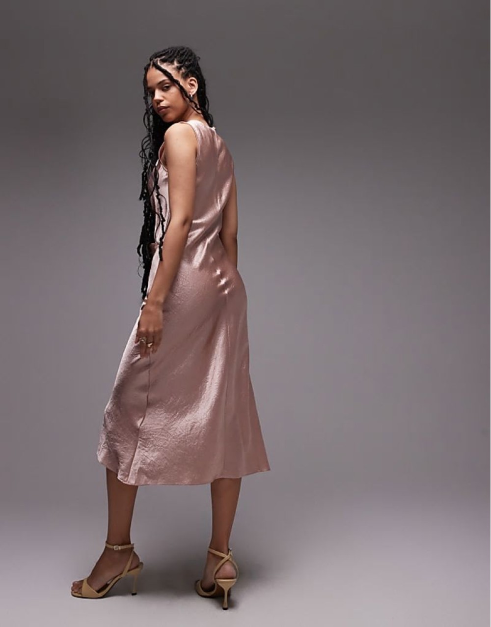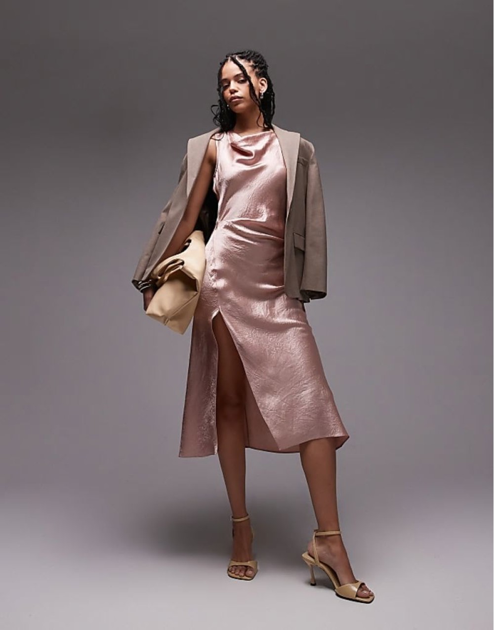 sveless hammered satin midaxi dress with drape detail and thigh split in light pink