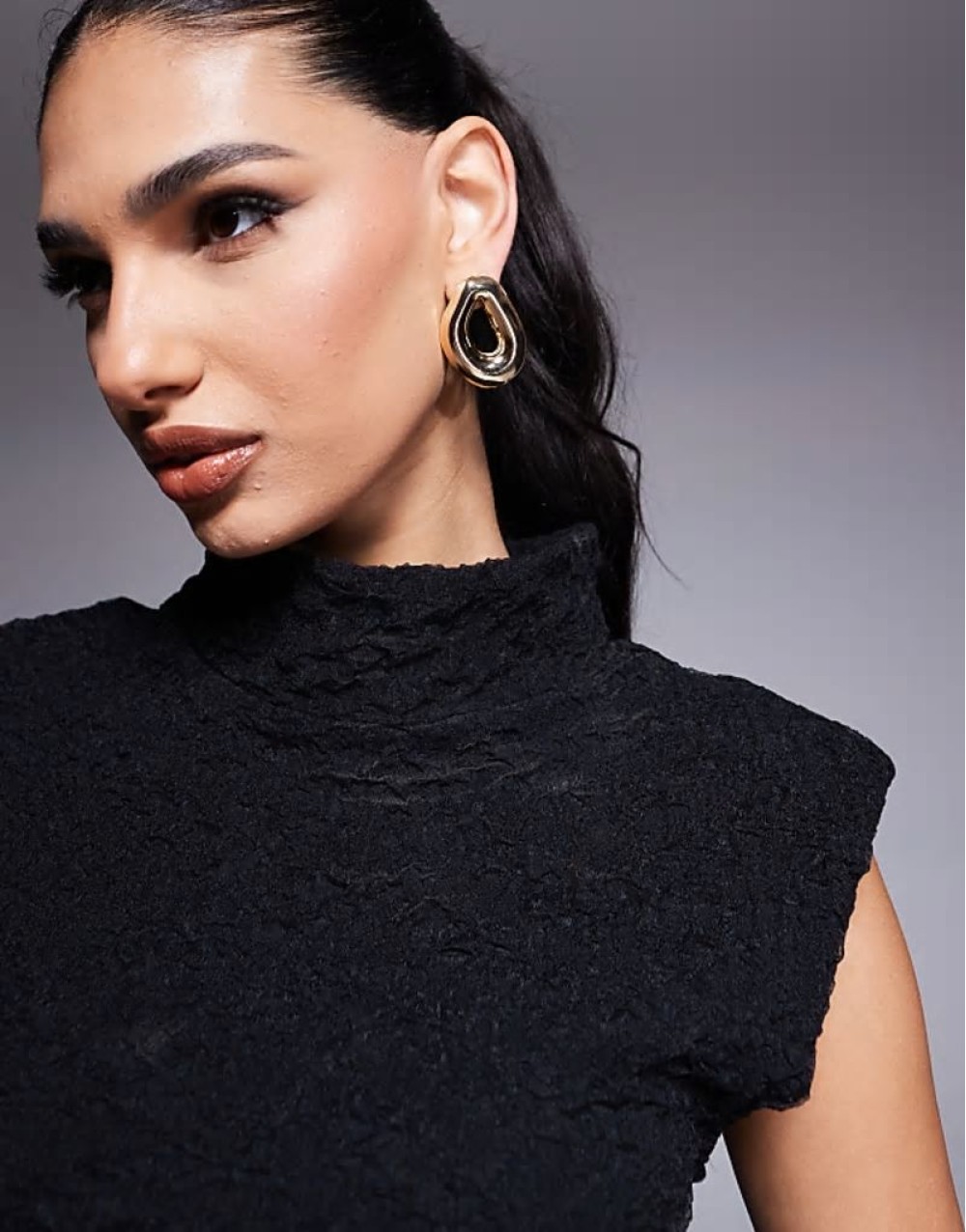 textured high neck vest top with shoulder pads in black